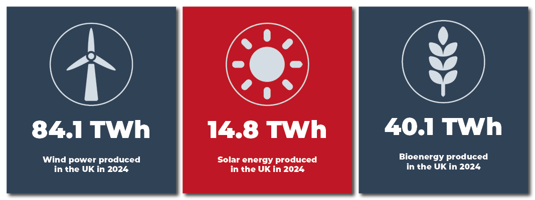 The contribution of major renewable energy sources in the UK in 2024. Source: https://assets.publishing.service.gov.uk/media/67e4f7c49c9de963bc39b526/Energy_Trends_March_2025.pdf